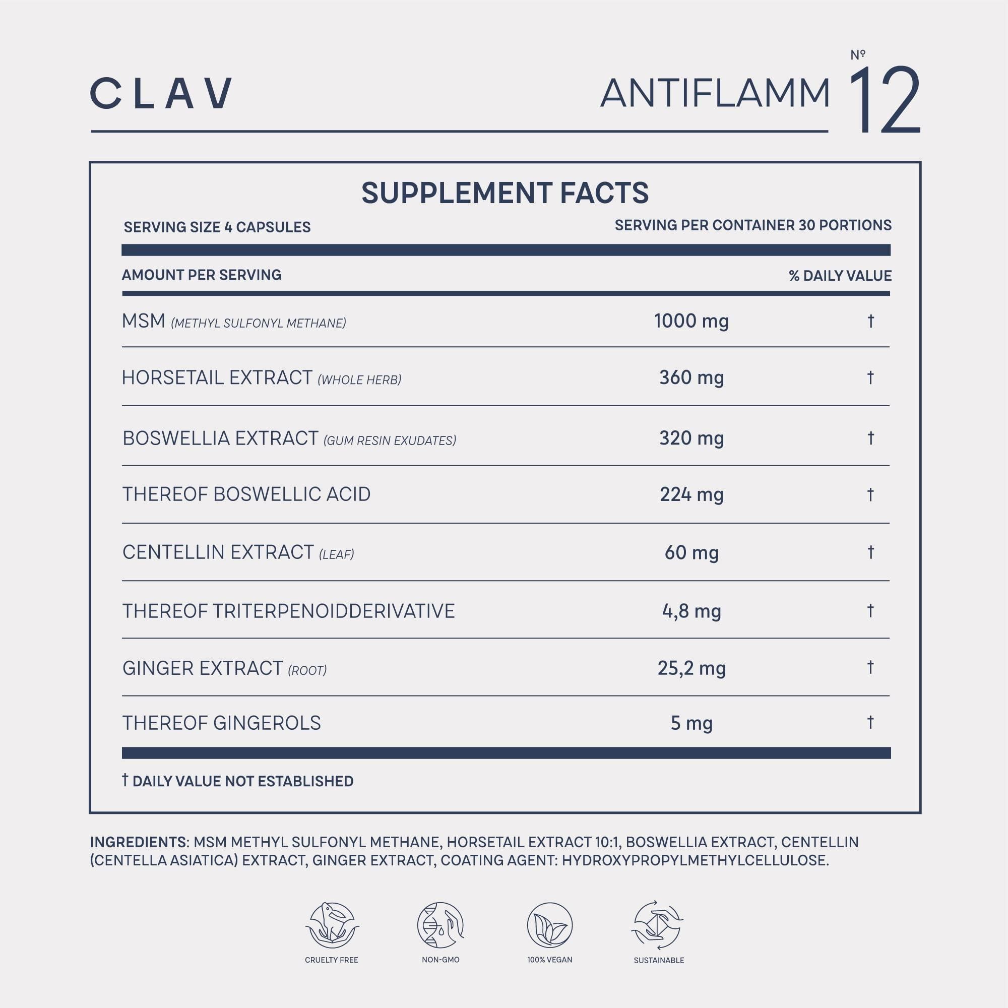 3.herbal antiflamm support - when everything burns, n12 antiflamm supports you in a purely herbal and natural way. boswellia serrata, msm, horsetail and ginger are useful supplements for your joints.