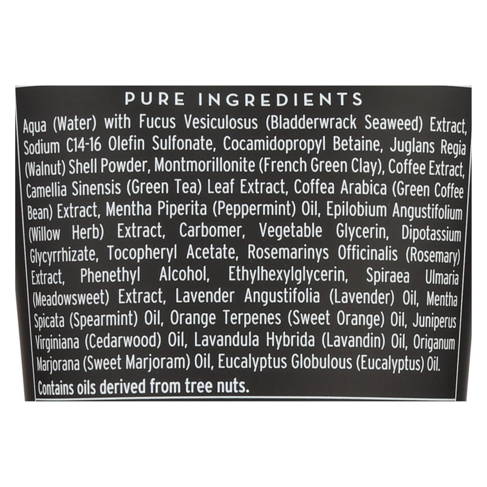 ingredients : aqua;water;with fucus vesiculosus;bladderwrack seaweed;and chlorella vulgaris extracts;juglans regia;walnut;shell powder;glycerin;cocamidopropyl betaine;sodium;c14-16;olefin sulfonate;phenethyl alcohol;ethylhexylglycerin;triethyl citrate;rosmarinus officinalis;rosemary;leaf extract;lavandula angustifolia;lavender;oil;mentha piperita;peppermint;mentha spicata;spearmint;orange terpenes;juniperus virginiana;cedarwood;eucalyptus globulus;eucalyptus;lavandula hybrida oil;origanum majora;sweet marjora