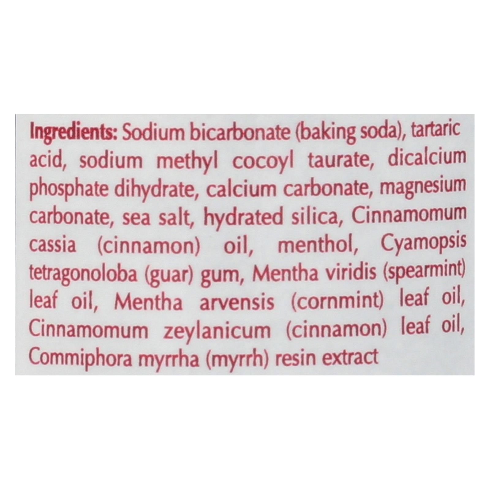 ingredients : sodium bicarbonate;baking soda;tartaric acid;sodium methyl cocoyl taurate;dicalcium phosphate dihydrate;calcium carbonate;magnesium carbonate;sea salt;hydrated silica;cinnamomum cassia;cinnamon;oil;menthol;cyamopsis tetragonoloba;guar;gum;mentha viridis;spearmint;leaf oil;mentha arvensis;cornmint;cinnamomum zeylanicum;commiphora myrrha;myrrh;resin extract