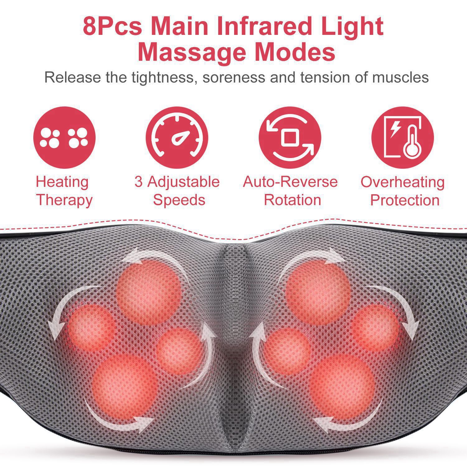 *Heat Function & 3 Speeds*:8Pcs Main massage nodes are designed with heating infrared light,bring warmth to your muscles and result in speeding up blood circulation. 3 Adjustable speeds from slow to fast provide multiple options to fit for various people demands,like teenager,adults,seniors and pregnant woman.