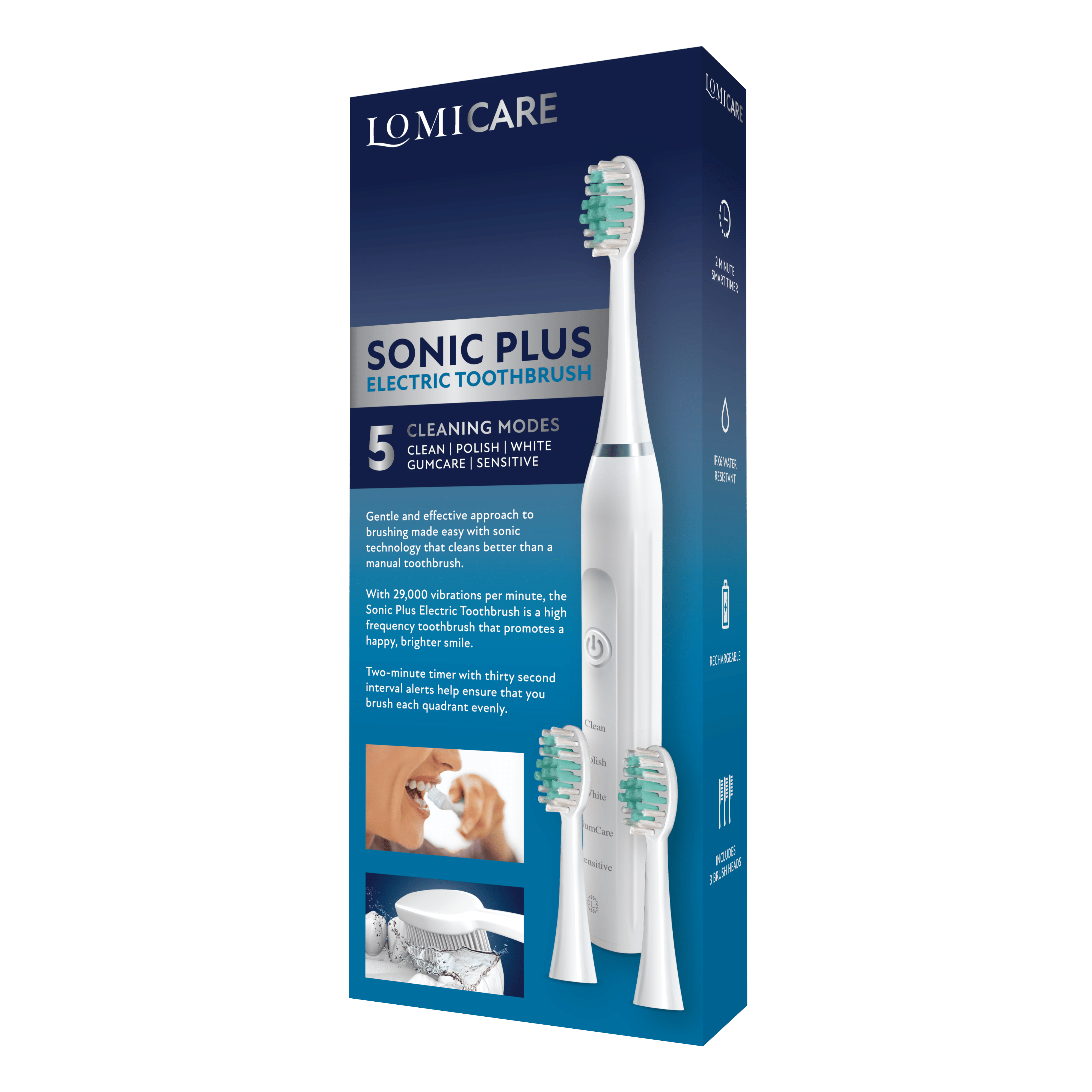 Gentle and effective approach to brushing made easy with sonic technology that cleans better than a manual toothbrush. With 29,000 vibrations per minute, the Lomicare Sonic Plus Electric Toothbrush is a high frequency toothbrush hat promotes a happy, brighter smile.