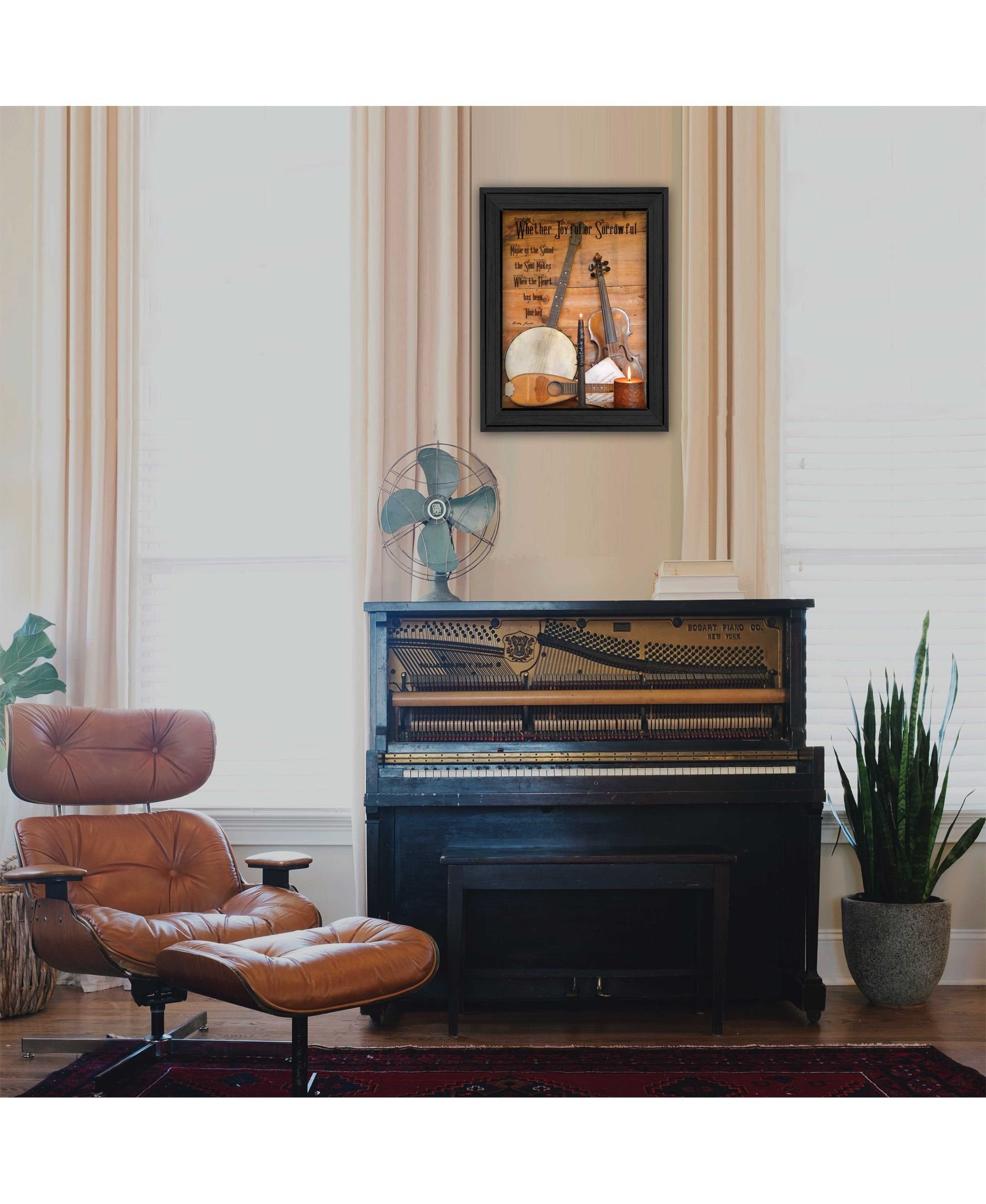 BJ1003-405 "Music" is a 15"x 21" framed script print. This artwork features a violin, banjo and candles and reads that music is the sound the soul makes…by artist Billy Jacobs. This totally American Made wall decor item features an attractive black frame, a textured canvas like finish so no glass is necessary and is ready to hang by means of a keyhole slot.•Women Owned (WBE)•Textured Artwork with a 'rolled on' acid free acrylic coating to create a canvas painting effect. No glass is necessary.•UV protectant coating protects artwork from fading.•MDF moulding adds natural beauty to the framed art. Frame is keyholed for ease of hanging.