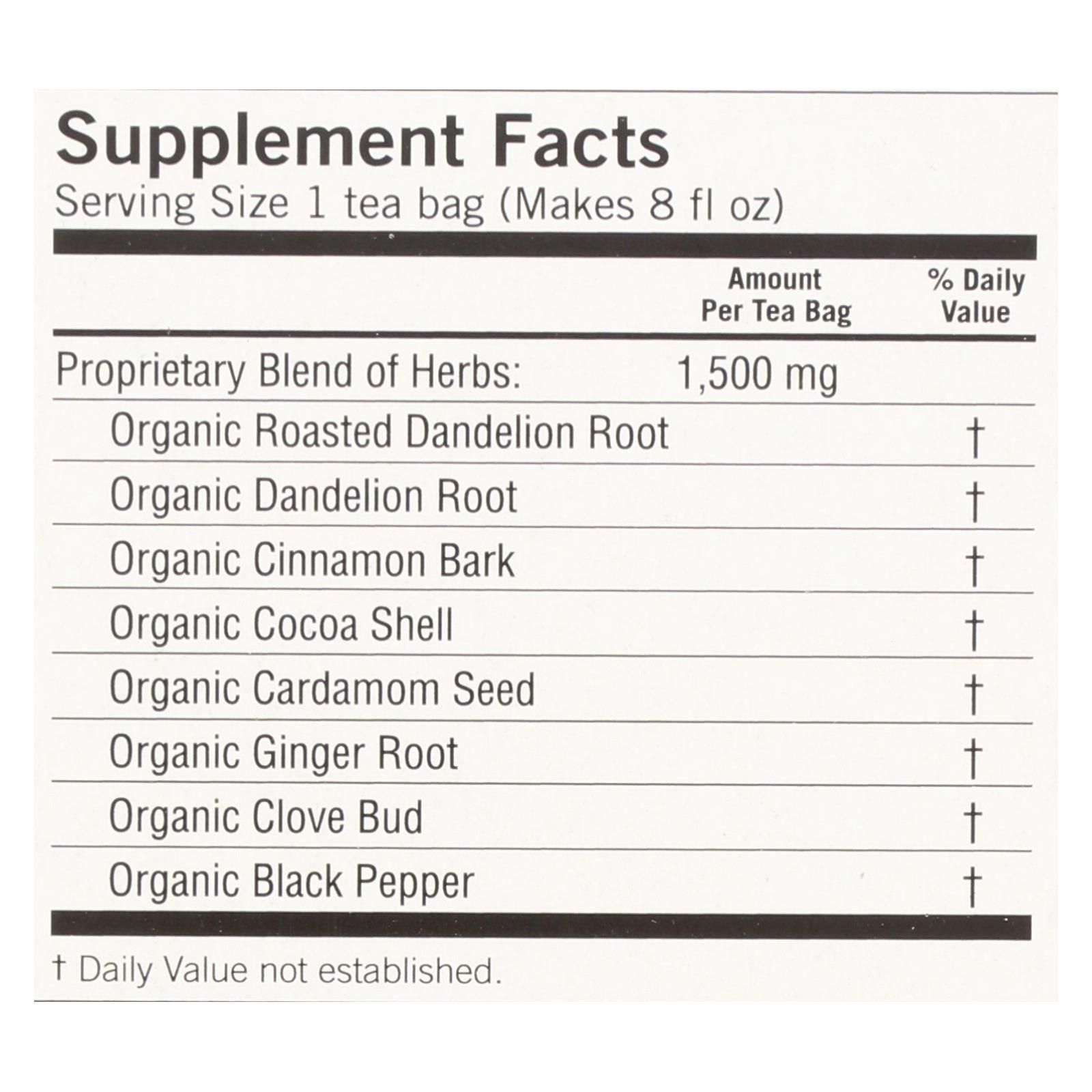 Yogi roasted dandelion spice detox spiced cocoa is packaged in 16 tea bags, each of which will make an 8 fl. Oz. Cup of herbal tea. Steep your tea bag in hot water for 7 minutes. This tea comes in a spicy formulation to support your body's natural cleansing process. Yogi roasted dandelion spice detox is kosher, non-gmo, organic and caffeine-free. The oxygen-bleached tea bags are compostable.