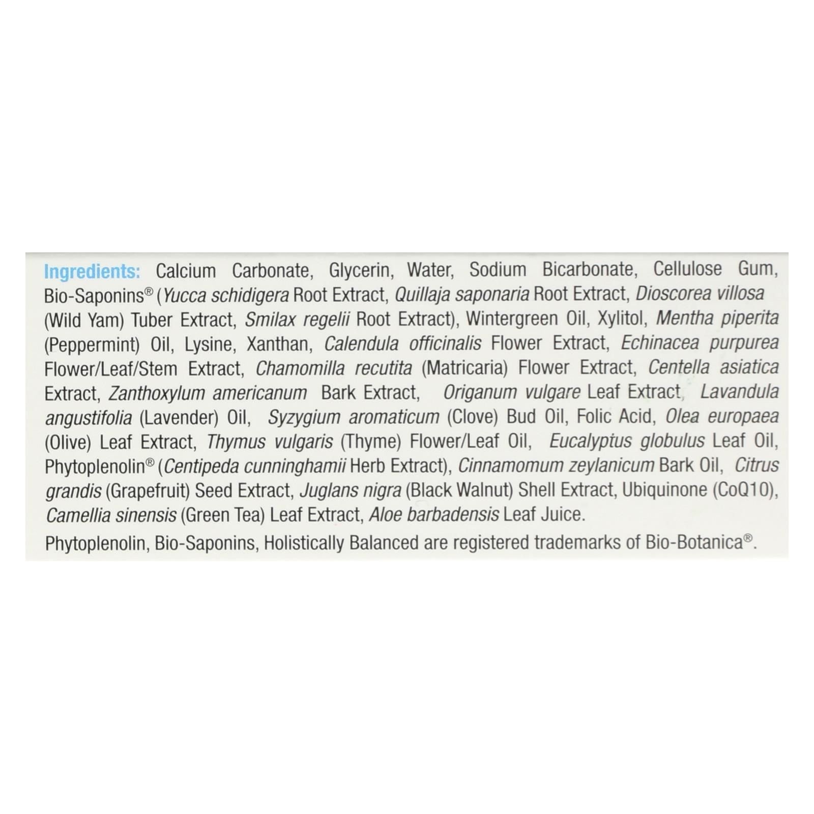 ingredients : calcium carbonate;glycerin;water;sodium bicarbonate;cellulose gum;bio-saponins®;yucca schidigera root extract;quiillaja saponaria root extract;dioscorea villosa;wild yam;tuber extract;smilax regelii root extract;wintergreen oil;xylitol;mentha piperita;peppermint;oil;lysine;xanthan;calendula officinalis flower extract;echinacea purpurea flower/leaf/stem extract;chamomilla recutita;matricaria;flower extract;centella asiatica extract;zanthoxylum americanum bark extract;origanum vulgare leaf extract