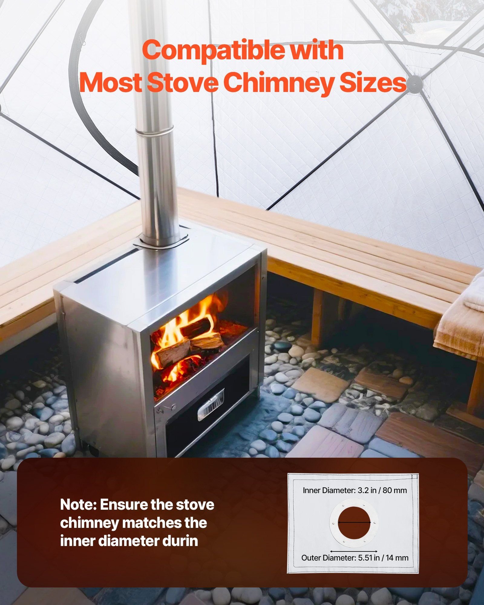 2.Compatible with Chimney Stove: Equipped with a built-in stove mat. When installing a chimney stove, please use one with an inner diameter of 3.2 inches (80 mm) or less